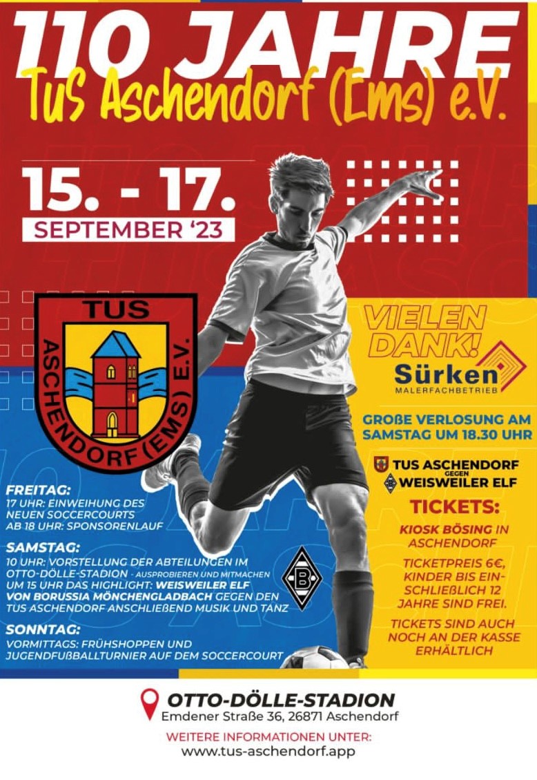 Am Samstag, den 16.09.2023 spielt die Weisweiler Elf zum 110 jährigen Jubiläum um 15 Uhr beim TUS Aschendorf. Kader: Kässmann – Anagnostou – el Khattouti