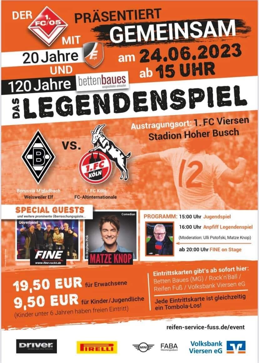 Am Samstag, den 24.06.2023 spielt die Weisweiler Elf um 16.00 Uhr in Viersen gegen den 1. FC Köln. Zum Jubiläum „50 Jahre Pokalsieg“ als Günter